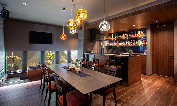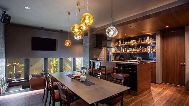この家に招かれたゲストが、期待で胸をワクワクと弾ませるダイニングキッチン。オーダーメイドだからこそ葉えられるオンリーワンの居場所です。打ち合わせ時の対話で伺った、ゲストを想うお?遣いをそのまま実現。全體的にシックな住まいの中に、鏡と照明を使った艶やかな空間を生み出しました。
