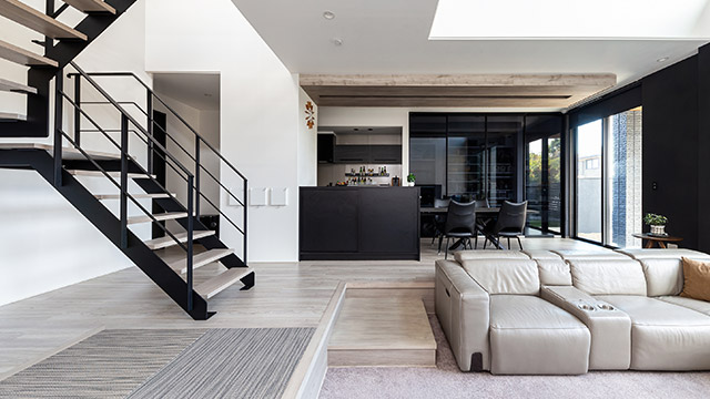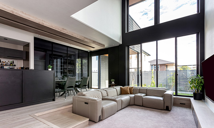 庭に面した?開?の窓が気持ちいい開放的なロースタイルリビングとキッチン。カーペット敷きにすることで、寢転んだり、座ったり、お?さまも?由に遊べる空間に。ブラックのアクセント壁紙は、?きな複數の窓を?體化して見せる効果があり、ロールスクリーンのカーテンをスマートに隠すこともできます。?た?だけではなく、実?性も兼ね備えた心地良い空間です。