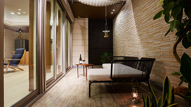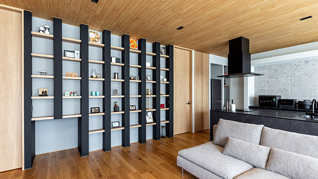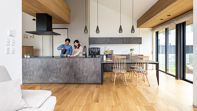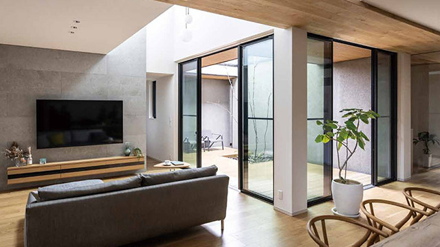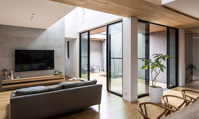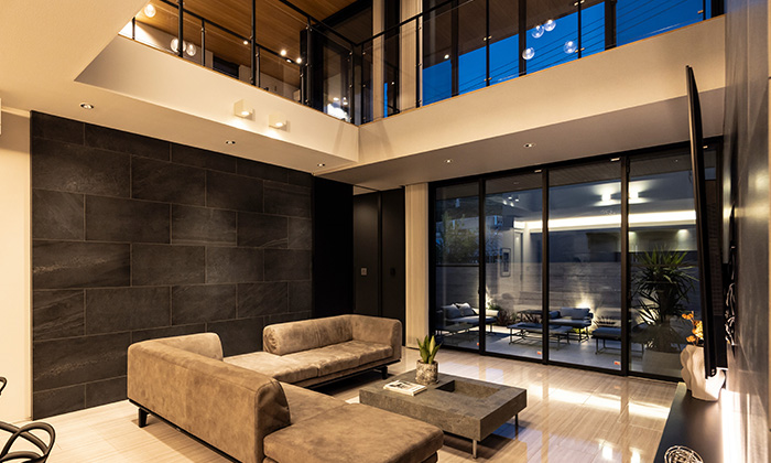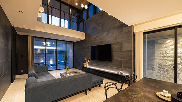 中庭に?した2方向のハイサッシから、たっぷりと光が降り注ぐLDK。中庭のおかげで??を気にすることなく、深い軒が強い日射しを遮るため、晝夜問わずカーテンレスで過ごせます。化粧天井の?然??が醸し出すラインと、コーヒー?を再利?した風合いのあるタイル壁が、空間に居心地の良さをプラスしてくれます。