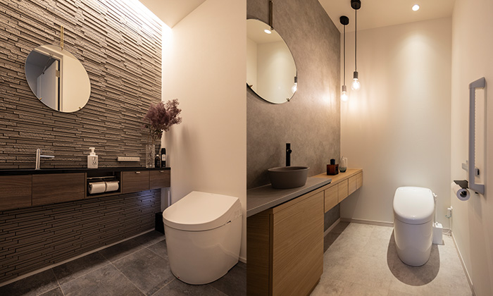 左の寫真は、凹凸のあるアクセントタイルに上からの間接照明を組み合わせ、タイルの陰影を強調させつつ、空間にやさしい光を広げています。ダーク系コーディネートと間接照明で、落ち著いた空間に仕上げました。右の寫真は「ナチュラルな空間にしたい」とのご要望から、グレーを基調にオークの風合いを生かした造作?洗いをご提案。ペンダント照明は、シンプルな形でありながら?低差を付けて吊るすことで、空間にアクセントを加えています。