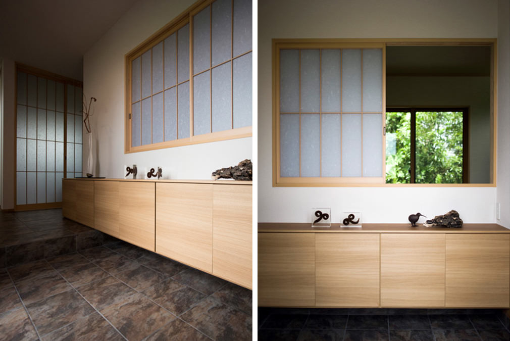 開放的な印象をもたせるため、玄関ホールは広めに設け、重厚感のある黒いタイルを三和土(たたき)から廊下まで連続させました。下足箱を低く橫長にすることで空間全體の重心を下げるとともに、障子から漏れる自然光によって和の雰囲気を演出します。正面の障子を開くと、和室奧のテラスの緑が目に飛び込んできます。