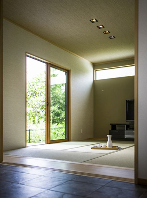 リビングにも、子どもたちの遊び場にもなる和の一室。來客時には応接室やゲストルームなど柔軟に活用でき、限りある空間を有効に使うことができます。正面のハイサッシは朝日を狙ったもの。畳と廊下のタイルとの間には板の間を挾み、デザインを品良く整えました。