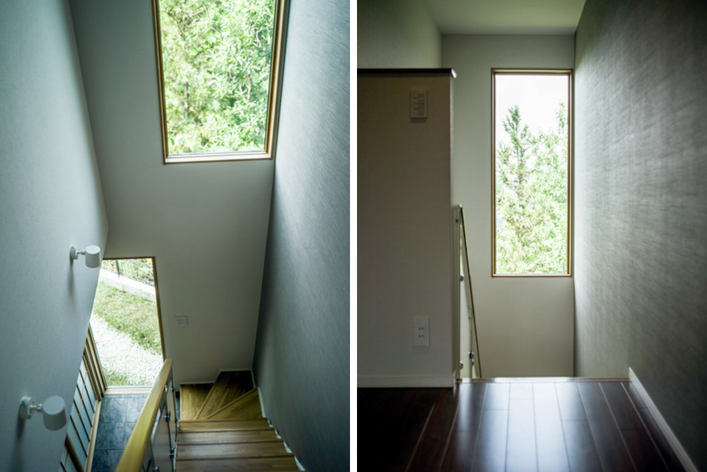 階段の吹き抜けに設けた2つのFIXウィンドウからは、北のやさしい光が訪れます。「朝、目覚めて階段を下りていく時に、美しい緑の景色が目を楽しませてくれる」と、2つの窓の効果を日々実感していただいています。