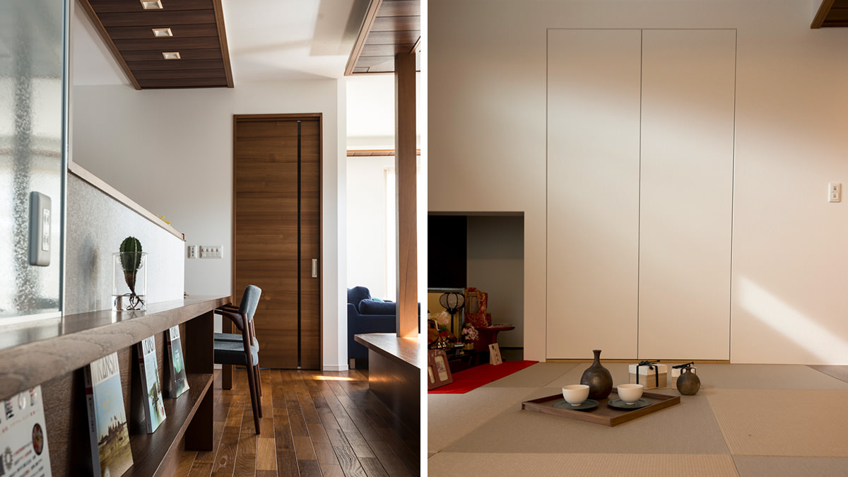 ダイニングテーブルと連続させて、造り付けのライブラリーコーナーをデザイン。ディスプレイする本によって雰囲気を変えられる、魅せるための収納空間です。一方、畳コーナーの押入れはクロスで仕上げて取っ手を省き、存在感のないシンプルな収納空間としました。