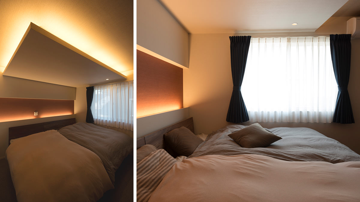 主寢室は落ち著いた色調でコーディネート。ベッドボード代わりのニッチには赤系のクロスを張り、下からの間接光で照らします。また、天井は少し下げてコーブ照明を取り入れました。あたたかみのある光の効果で、リラックスできる雰囲気をつくります。