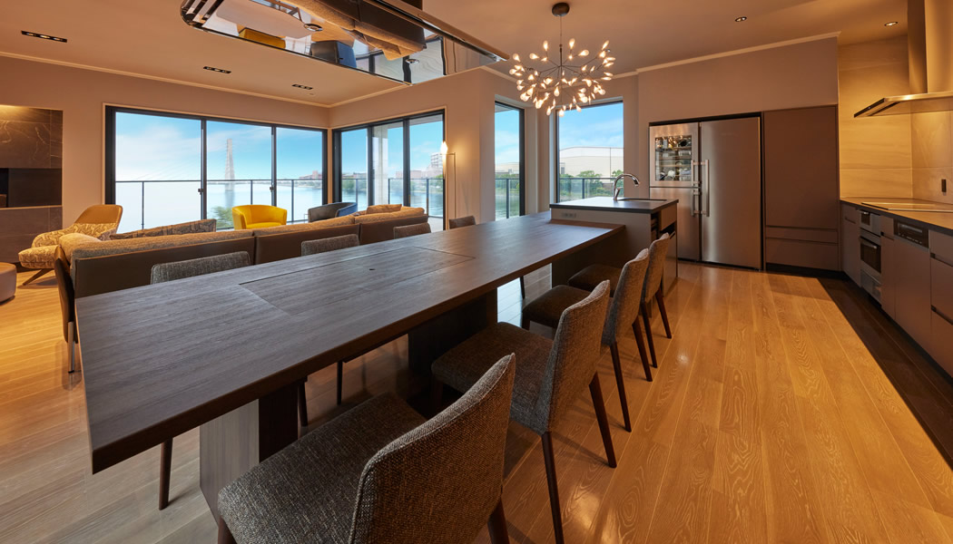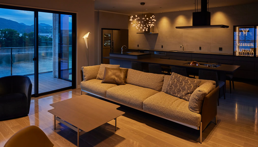 リビング:夜はしっとりと過(guò)ごせる様、照明はグレアレスを使用、窓への映り込みが無(wú)い為、夜景を綺麗に眺められます。