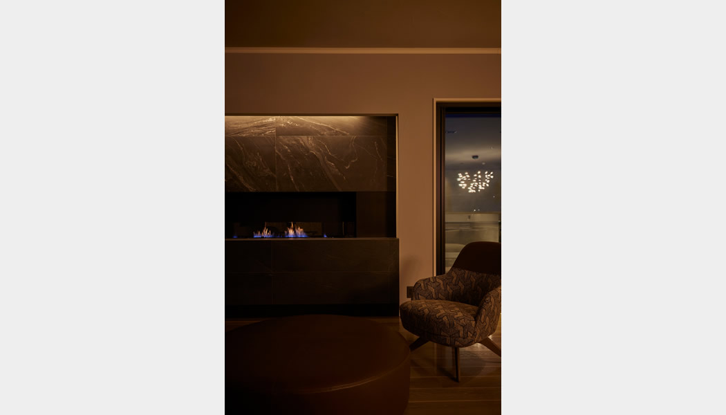 リビング:お部屋の明かりは最小限に、暖爐の明かりでお好きなお酒をゆったりと楽しめます。