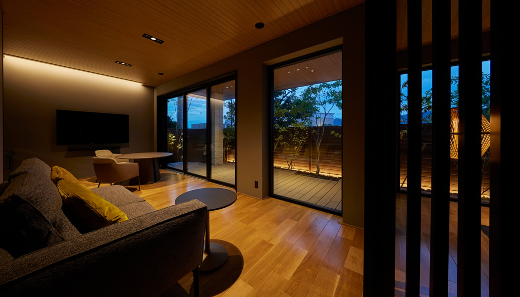 1階プライベートリビング:ルーバーにより目隠しされた寢室と一體で利用出來(lái)ます。広いテラスをL字に囲み開(kāi)放的です。