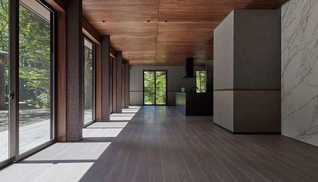 內観2:床と天井の木質感と濃いグレーの壁とのコントラストが落ち著きを生んでいる。