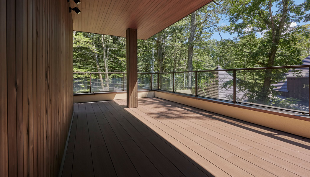 バルコニー:軒を深く掛けたバルコニー。ガラス手摺によって広がり感を演出している。