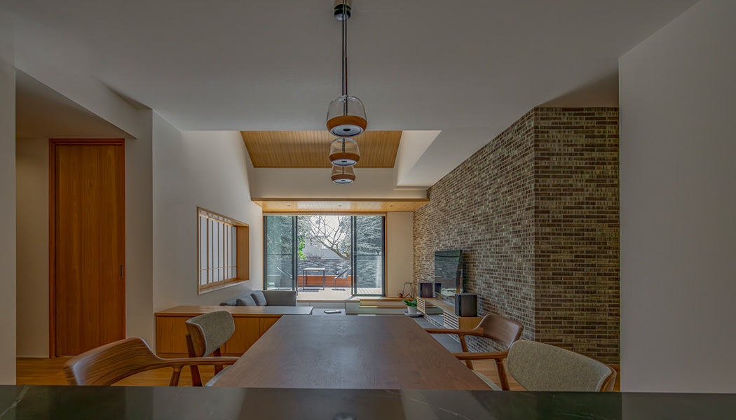 LDK:視線の軸を主庭の桜へ通しつつ、床?天井のアップダウンや仕上げの操作によって多様な居場所を創(chuàng)出。