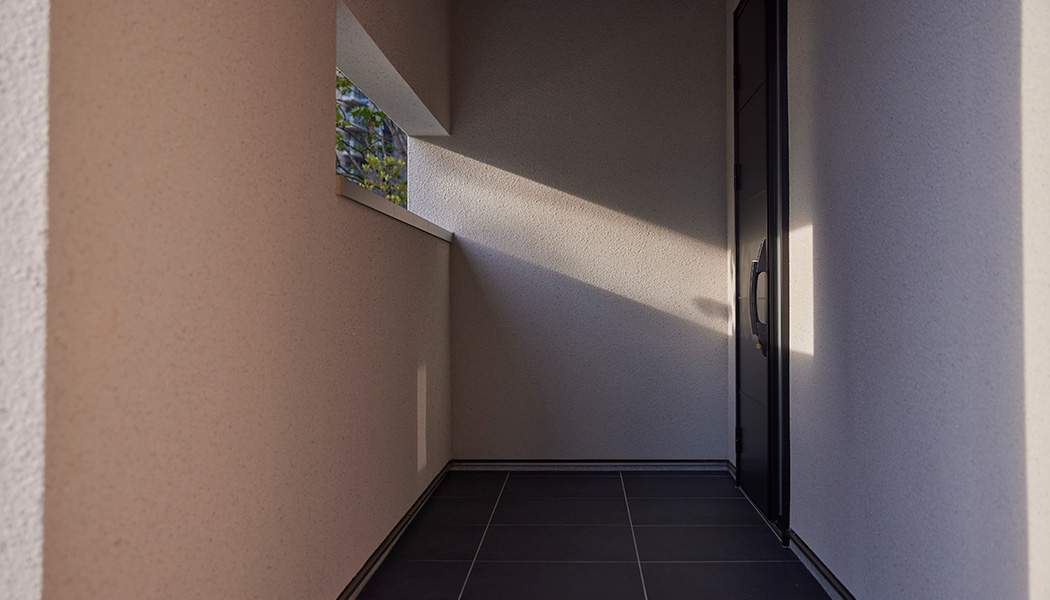 玄関へのアプローチ:玄関扉の正面に2階の窓サイズと合わせたスリットを設け、緑を楽しみ広がりを感じる工夫を凝らした。