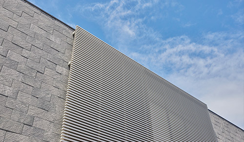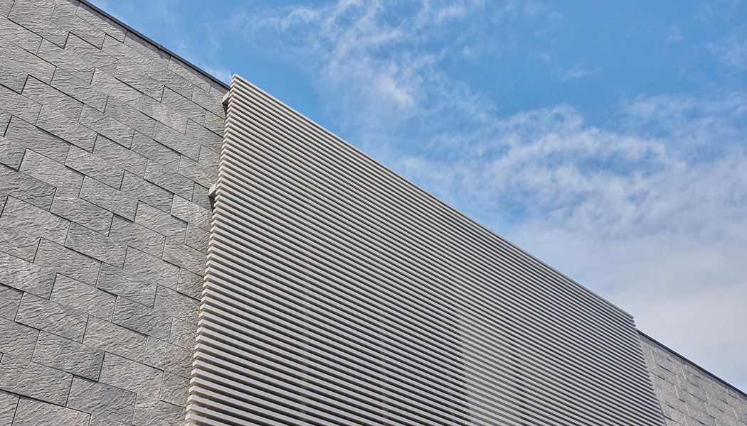 外観:ステンレスカラーのシャープなルーバーが青い空に映えます。
