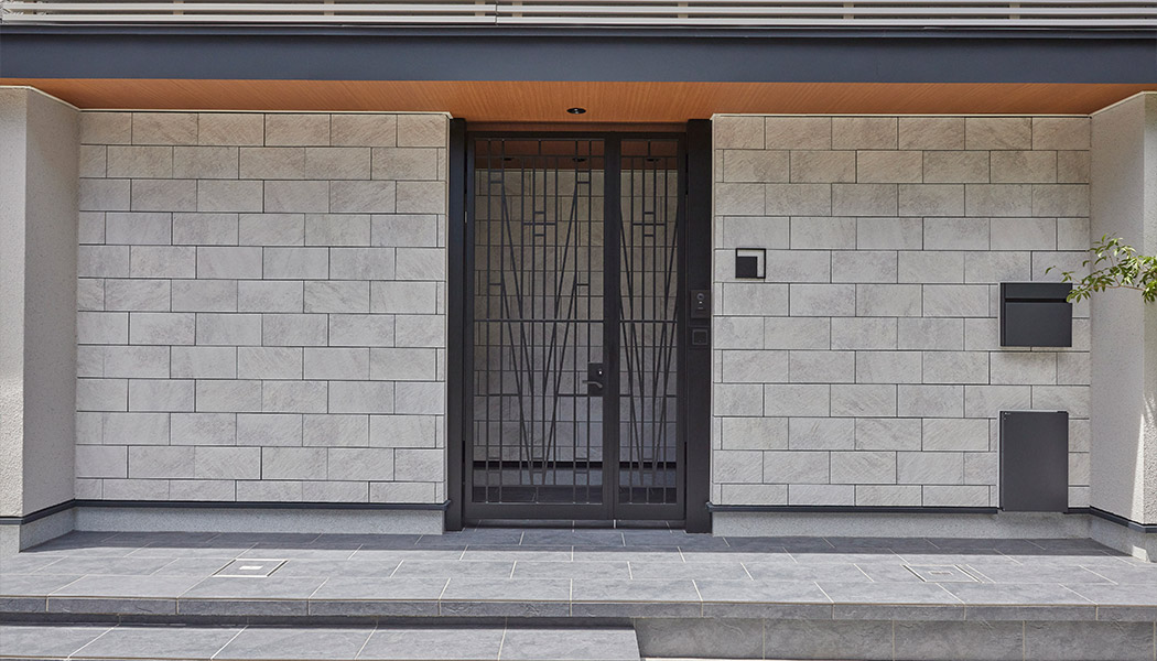外観:玄関ドアを見せずにロートアイアンで門扉を造りセキュリティに配慮。