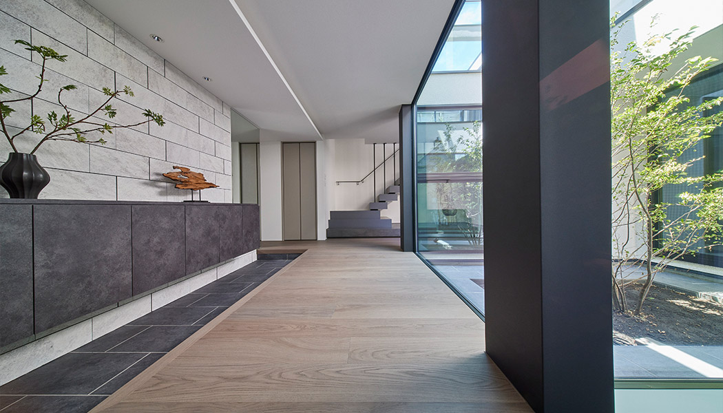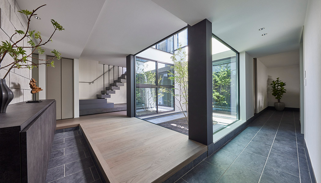 玄関:玄関ドアを開けると開放感のある中庭と広々した玄関が目の前に広がります。
