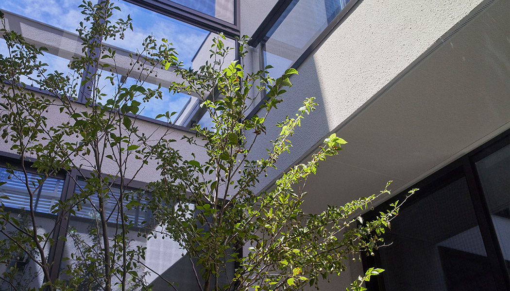 中庭:中庭のエゴノキの緑が住む人と來客に四季を感じさせてくれます。