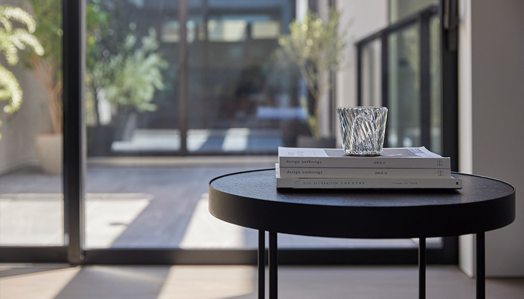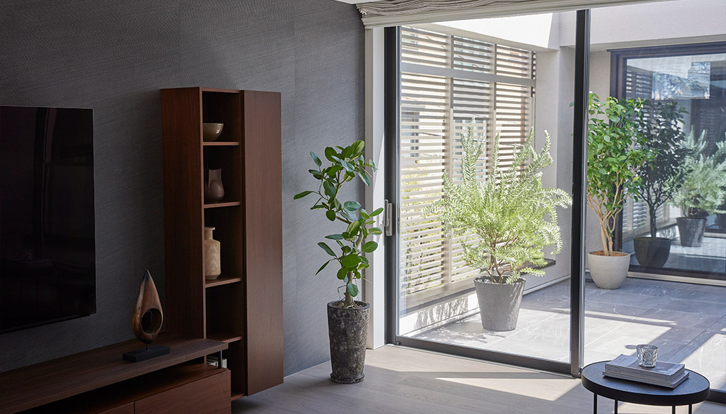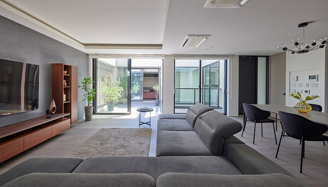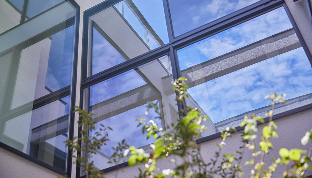 中庭:中庭のサッシに青い空と雲(yún)の流れが美しく描寫されゆっくりとした時の流れを感じさせてくれます。
