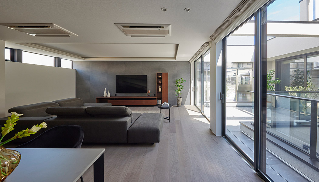 リビング:バルコニーに面する広々リビング。グレーのフロアがスタイリッシュに空間を構(gòu)成します。