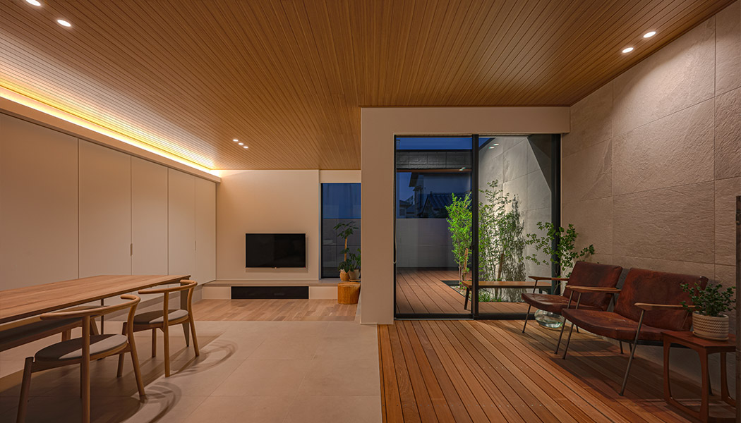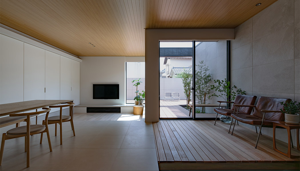 LDK:內外に続く壁面で一體感をつくり、反射光で室內へ深く光を運ぶ。