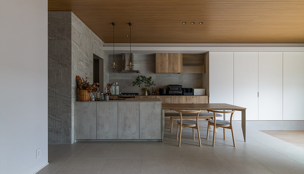 ダイニングキッチン:木と石、異なる素材が生み出す洗練された質感。