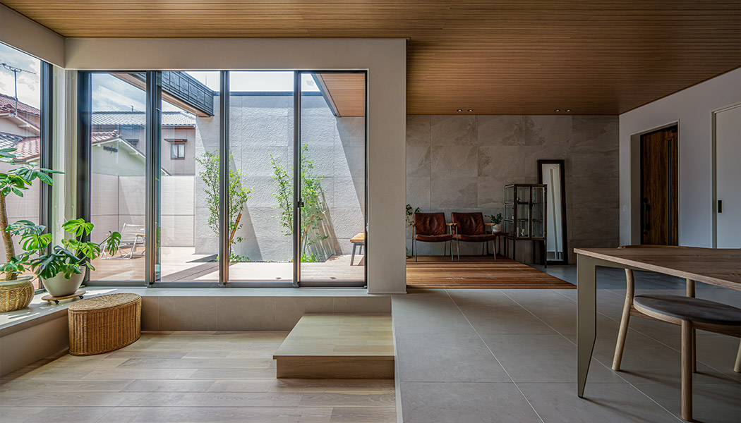 伸びやかに屋內外が一體となり、光、風、空、緑、陰影を豊かに感じることができる。清閑な時が流れ、悠然とした空気をまとう邸宅。