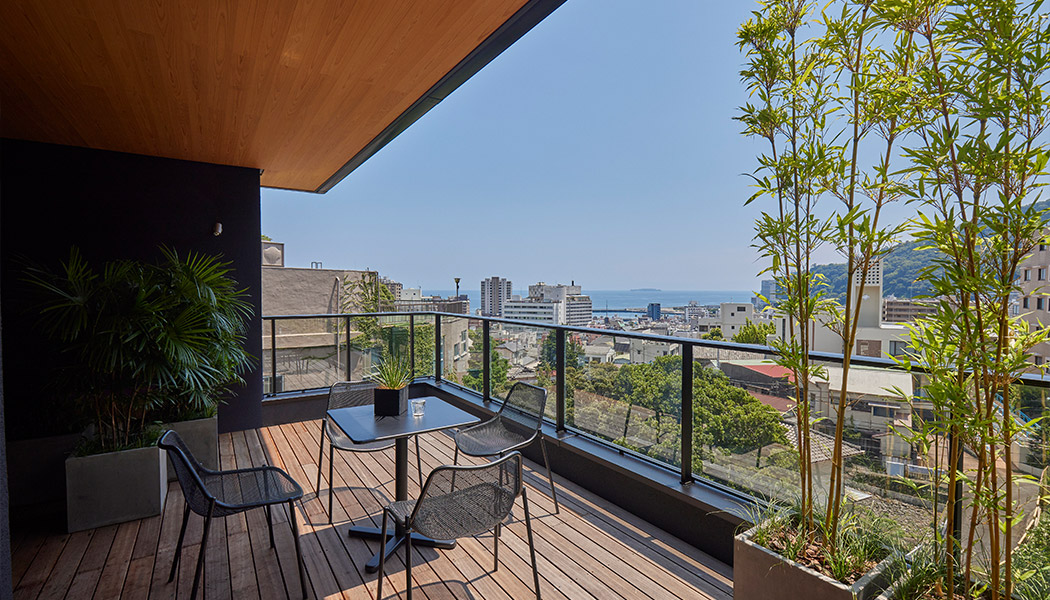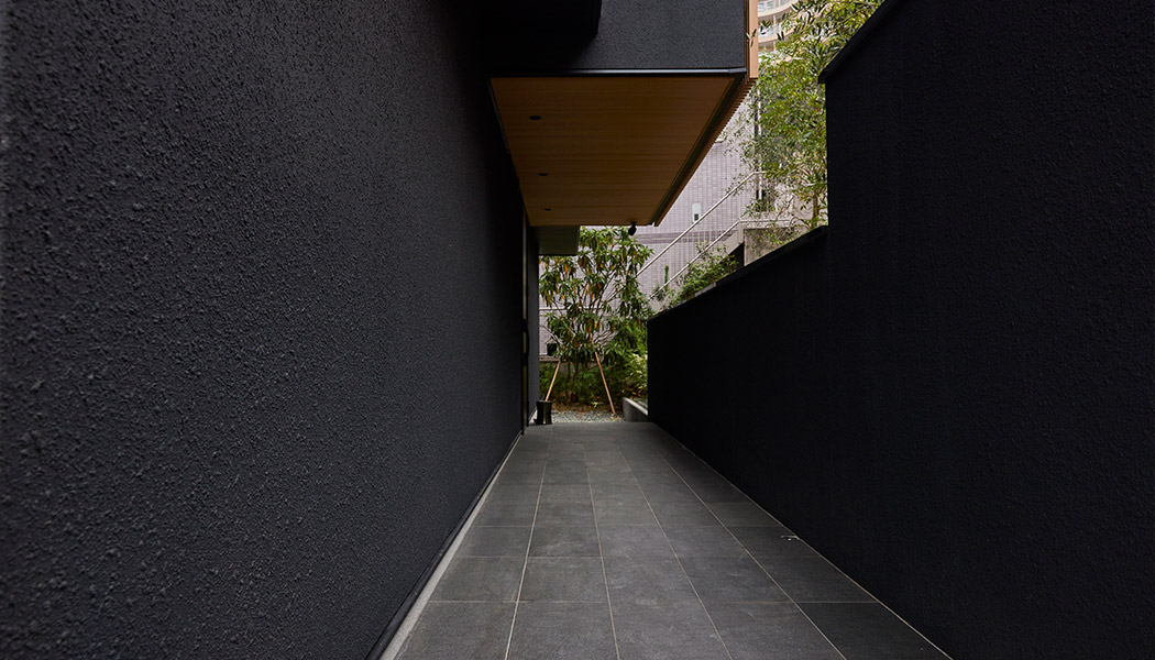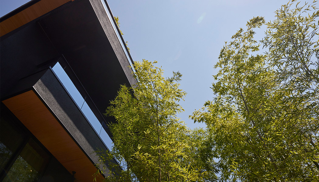 外観:竹林の緑と青空により、墨色のエッジがより際立っている。