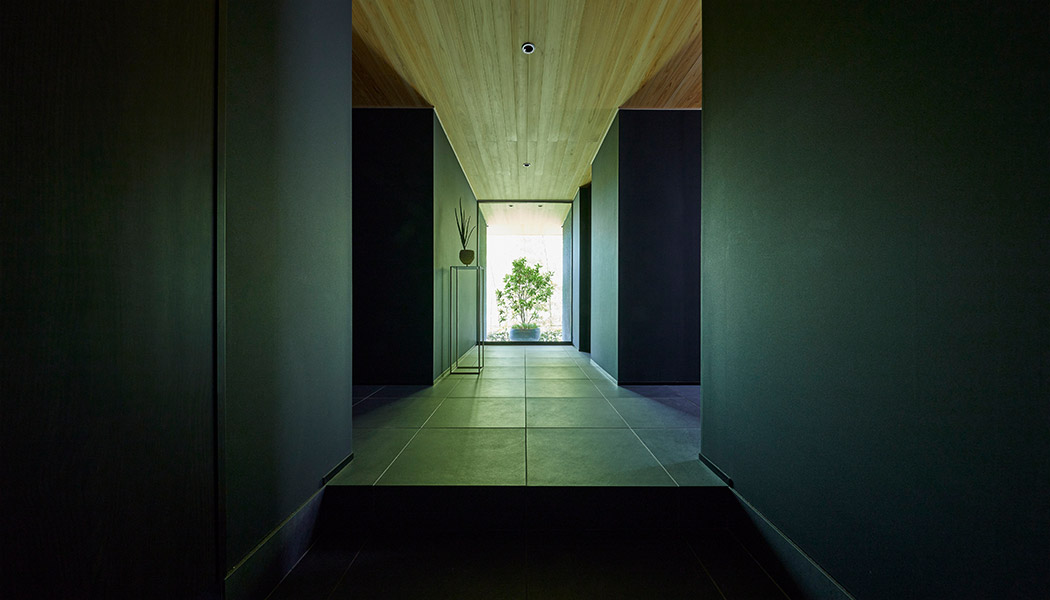 玄関:エントランスホール正面に坪庭を配し、しっとりとした抜け感のある空間をしつらえた。