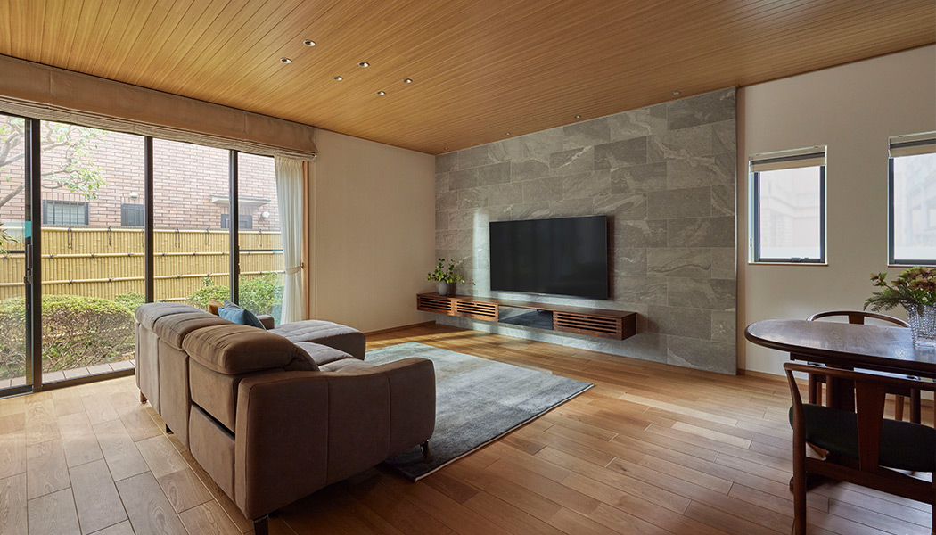 1階リビング:親世帯は従前の庭を殘しつつ、やさしく融合するインテリアに。