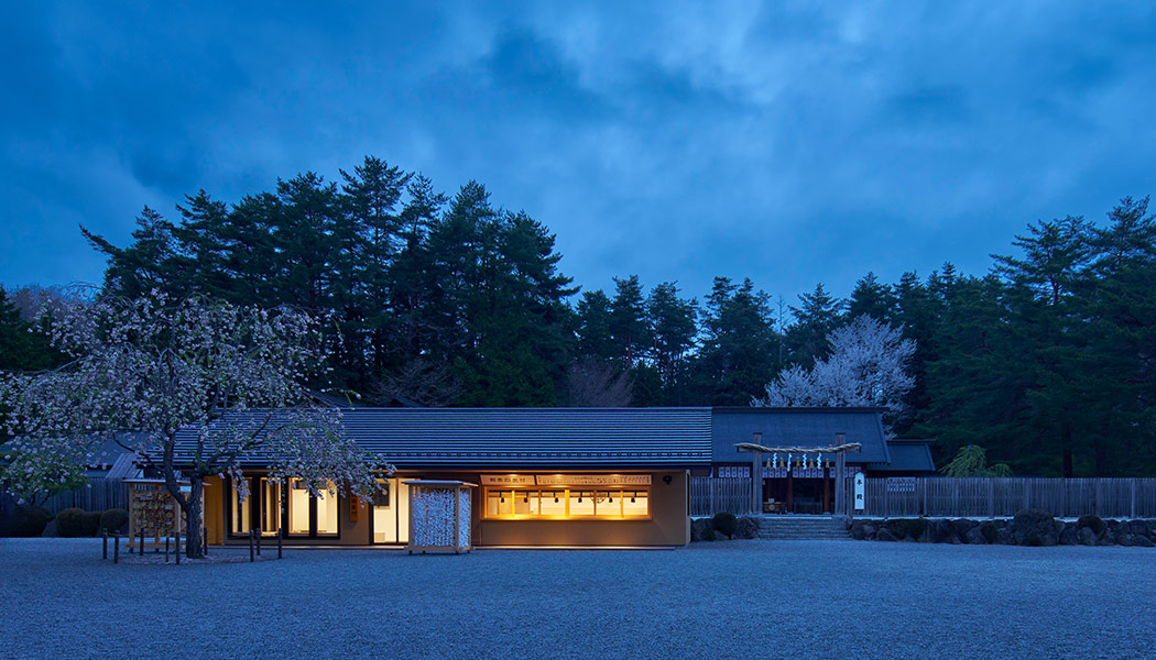 外観:薄暮の時間が神の領域であることを気づかせる~本殿を背景に。