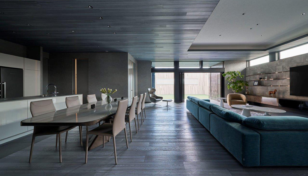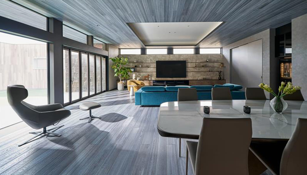 LDK:床と天井にラスティックグレイの木目を配し、モノトーンの空間に家具や観葉植物の原色がアクセントとなっている。