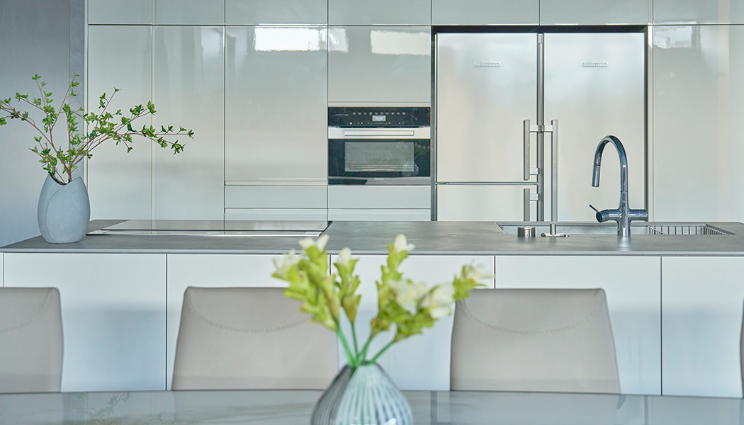 DK:白を基調とした清潔感あふれるアイランドキッチン。表には生活感が出ぬよう、バックヤードに大容量のパントリーを配している。