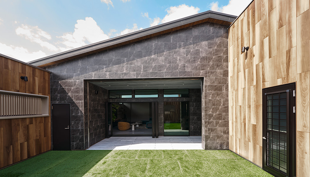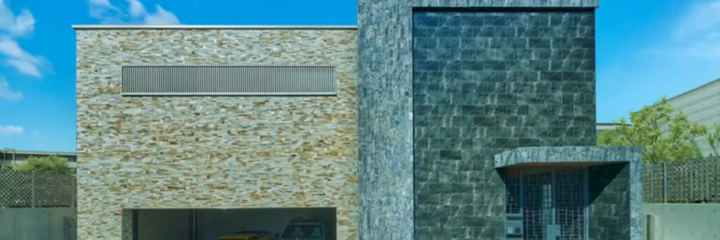 外観:外観中央にL型に配した石をあえて縦目にすることで、左右の箱の石とタイルの大きさが違うことが気にならない納まりとした。