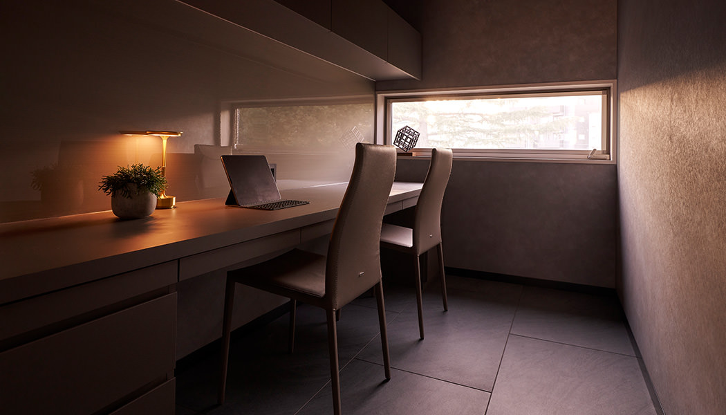 家事コーナー:LDKの一角に配した家事コーナーは、公園の緑を取り込み落ち著いた書斎風なデザインとした。