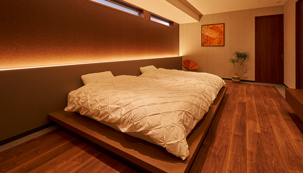 主寢室:暖色系の色合いでやすらぎを感じるコーディネートとし、ベッドフレームはマット位置が可変する造作家具とした。