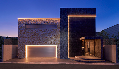 外部の開口を極限まで抑え、萬一の事態でも外敵をシャットアウト出來る間取りとした究極のセキュリティ住宅。マッシブでスクエアなデザインにライン照明を象徴的に使い輪郭を際立たせることにより、間取りに呼応した近未來的な外観デザインとしている。