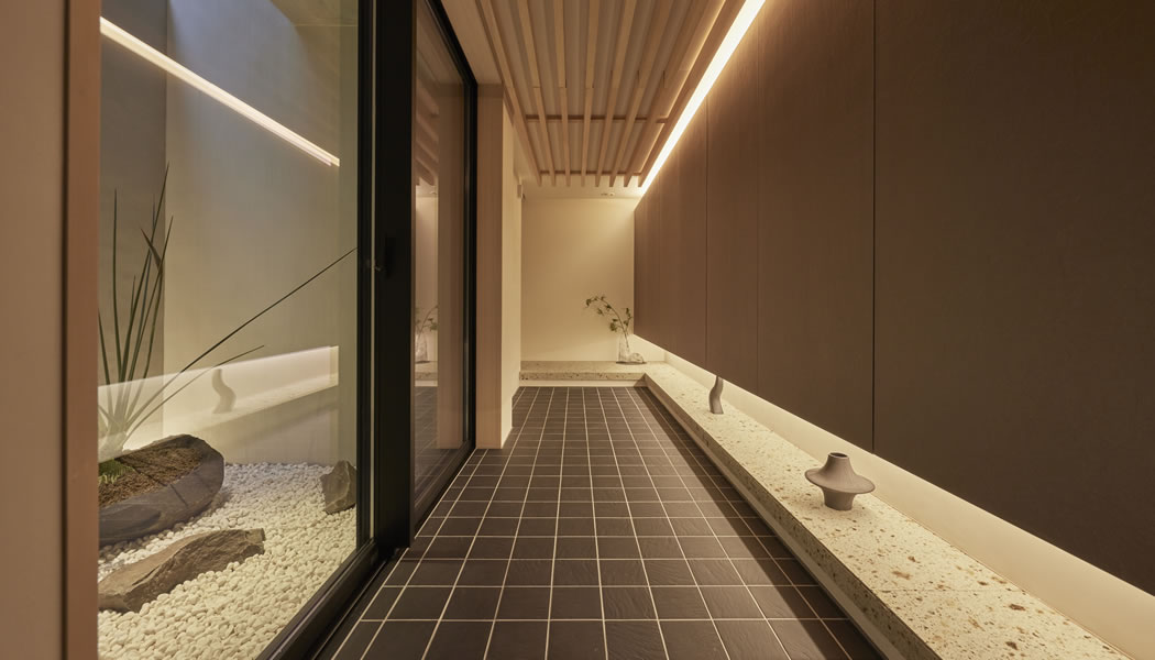 アプローチ:道路から玄関までのドラマティックなアプローチ。玄関に向かってゆっくりと下がっていく。