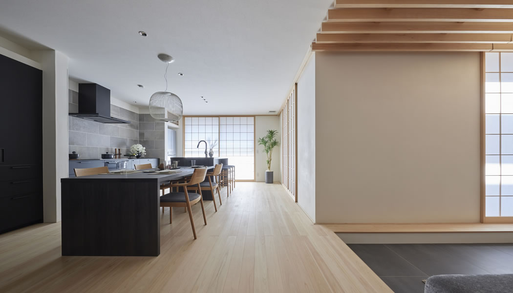 ダイニング、キッチン:DK。尾鷲檜の床に漆黒のキッチンが映える。