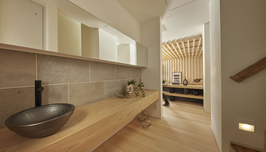 手洗カウンター:タモの造作手洗カウンター。陶器のボウルも和の匂いが漂う。