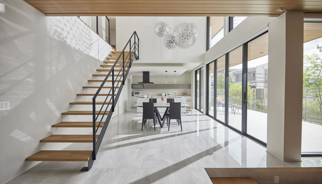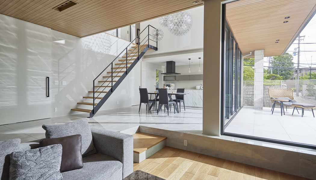 リビング、ダイニング、テラス:洗練された白のトーンに、木の質感が溫もりを添える。異なる素材の調和によって住まいの表情はより豊かになる。