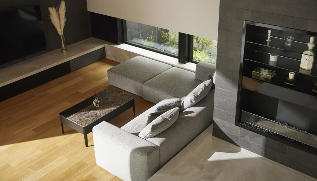リビング:床を掘り下げた居心地の良いリビング。深い落ち著きに包まれ、ゆったりとした時間を満喫できる。