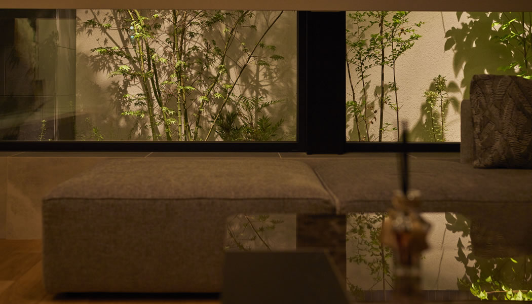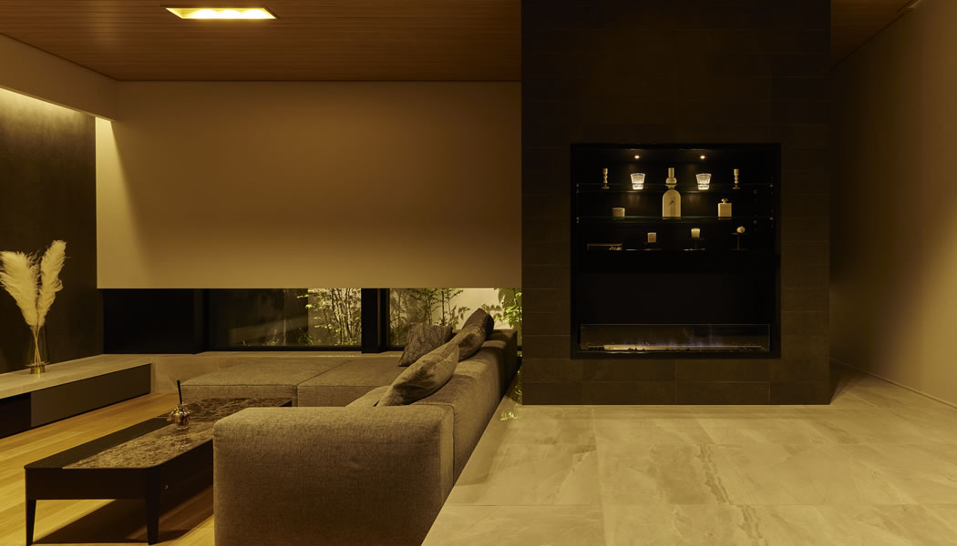 リビング:やわらかな明かりに包まれる照明計畫により、しっとりとした寛ぎを創り出す。