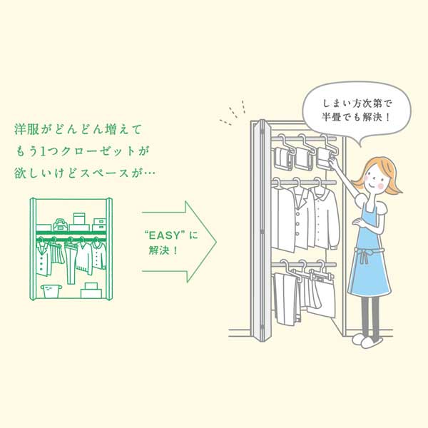 これまで使いこなせていなかったスペースを最大限に「使いきる」システムで、収納量アップ!棚板やパイプが固定された収納では収まりきらないとあきらめていたモノも、空間を有効に使えるシステムになっているから、毎日の「しまう」がもっと“EASY”に!