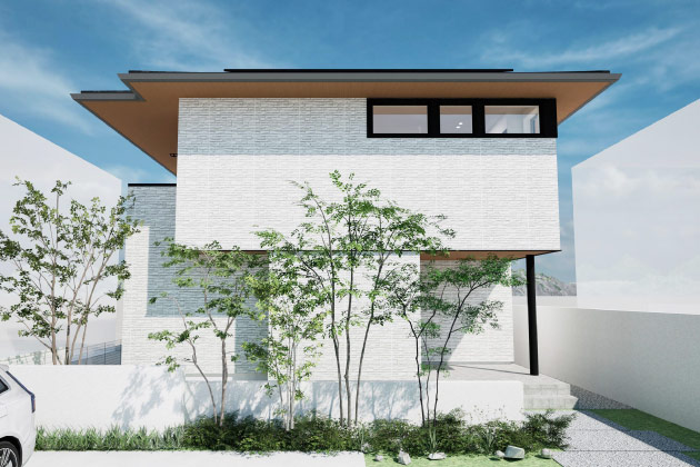 クールな濃色やホワイト色×やさしいナチュラル色をまとう個性派の佇まい。深い軒が美しい陰影を添えます。