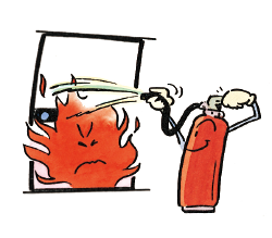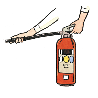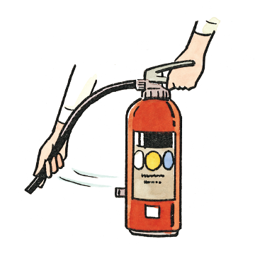 - 3ホースの先を火元に向ける。粉末タイプの場(chǎng)合は炎ではなく火元をねらう。強(qiáng)化液タイプでは、炎の上にかける。