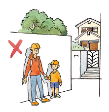 家から出て緊急時(shí)避難場(chǎng)所へ移動(dòng)する場(chǎng)合は、倒壊の危険があるブロック塀のそばや狹い道路は避け、なるべく広い道を選ぶこと。電柱が倒れてくる場(chǎng)合があります。頭をしっかりガードしながら、狀況判斷を的確に。