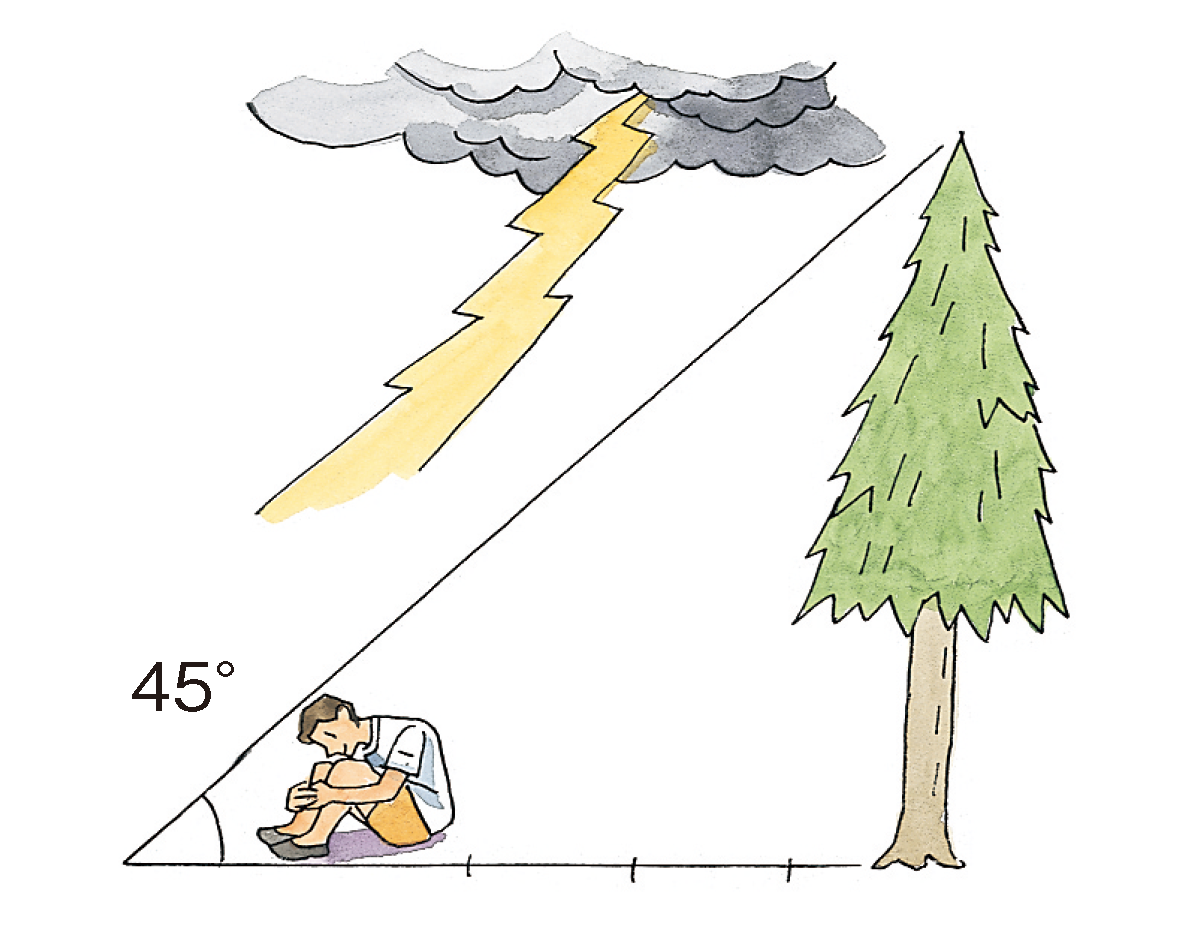 木の側(cè)は側(cè)撃を受ける危険性が高い。ただし、1本だけ木が立っているような場(chǎng)所では、木の幹、枝先、葉先から2m以上離れ、さらに木のてっぺんを45度以上の角度で見上げる範(fàn)囲內(nèi)で姿勢(shì)を低く保てば、側(cè)撃を受ける可能性は低くなります。