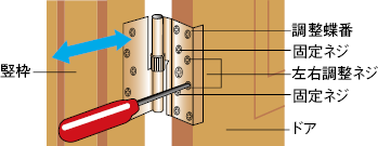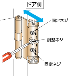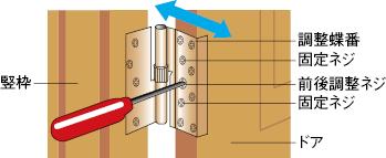 ドアの建付けが悪くなり、開閉に支障が生じる場合は、蝶番のネジを右または左に回転することによって、ドア枠とのすき間や倒れを調整することができます。