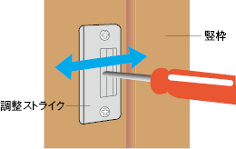 ドアを閉めた狀態で、ガタつく時やラッチのかかりが悪い場合は調整ストライクを動かして調整することができます。ネジを回すとストライク部が前後に±2mm動きます。