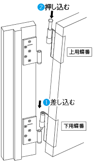- 2ルーズピンを上げた狀態で上用蝶番を枠側蝶番に引き寄せ、枠側蝶番の管に位置を合わせてピンを押し込みます。