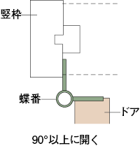 ピアノや大型家具の搬入のためにドアを外す必要が生じた場合は、ドアを90度以上に開き、持ち上げて蝶番の軸を抜き、橫に移動して取り外すことができます。